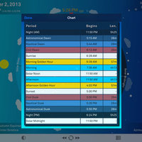 * Find solar midnight and solar noon, and all three twilight (dawn and dusk) periods: astronomical twilight, nautical twilight, and civil twilight. Keep tabs on the next solstice and equinox.