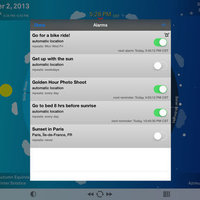 * Optional location-aware alarms. Sol knows when you change with your location; and as you travel it will adjust any alarms you set relative to sunrise and sunset times. Create alarms for multiple locations around the world.