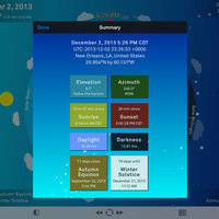 * Detailed almanac information: Useful information about the day's length, sun's azimuth and elevation, equinoxes and solstices, and a friendly glossary that explains all the terms.