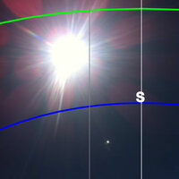 The solar path depends on your latitude, which is provided by the device's GPS. The accuracy of the displayed path also depends on the direction of view. Hold the device up, aim parallel to ground, and tap "Re-calibrate" in "Setup" mode until the map display matches your surroundings.
