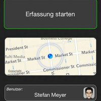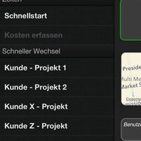 Es braucht nur zwei Berührungen des Bildschirms, und schon kann die Arbeit beginnen. Der Grund kann auch später noch gewählt werden, entweder als freier Text oder aus einer Liste eigener Favoriten. Die Position wird automatisch erkannt und mit einem Kunden verknüpft, oder für den iPod touch aus einer Liste gewählt ( die zwar zuvor erstellt werden muss) aber auch direkt aus dem Adressbuch übernommen werden kann.