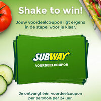 Bij SUBWAY® houden we wel van een beetje variatie. Én van voordeel! Daarom is er nu de gratis SUBWAY® app. Met de SUBWAY® app kun je elke dag een nieuwe voordeelcoupon ontvangen. Met deze coupon krijg je korting op bijvoorbeeld een Sub of een menu bij SUBWAY® restaurants. Wat je daarvoor moet doen? Heel simpel: alleen even je telefoon shaken!