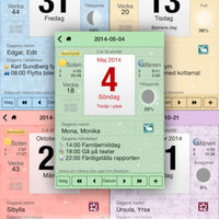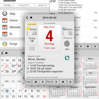 A Swedish calendar with locally useful information such as name of the day, offical holidays, flag days, sunrise/sunset, moonrise/moonset, phase of the moon, birthdays from your address book and more.
