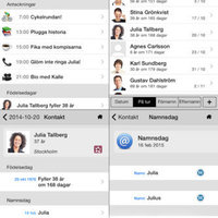 Du får automatiskt tillgång till alla dina kontakter med födelsedagar, så att du lätt ser vem som fyller år när, och deras eventuella namnsdagar. Du får både listor som kan sorteras på flera sätt, och behändiga kontaktkort som visar information om varje person. Ring, sms:a och maila direkt från almanackan.