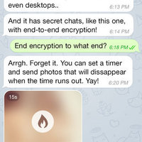 For those interested in maximum privacy, Telegram offers Secret Chats. Secret Chat messages can be programmed to self-destruct automatically from both participating devices. This way you can send all types of disappearing content — messages, photos, videos, and even files. Secret Chats use end-to-end encryption to ensure that a message can only be read by its intended recipient.