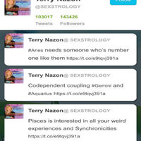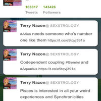 Terry Nazon World Famous Astrologer Horoscopes now available on a mobile App access horoscopes, Join the conversation on Facebook and have immediate access to terry's Zodiac Quips on Terry's Twitter @Sexstrology order reports and get the latest Astrology updates
