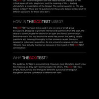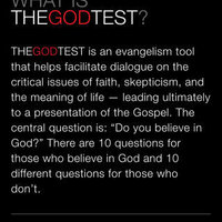 THEGODTEST is an evangelism tool that helps facilitate dialogue on the critical issues of faith, skepticism, and the meaning of life — leading ultimately to a presentation of the Gospel. The central question is: “Do you believe in God?” There are 10 questions for those who believe in God and 10 different questions for those who don’t.