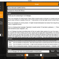 NOTE: The Proposal is powerful and provides an easy means to create proposals. It is not a full-fledged word processor or spreadsheet program and does not support text formatting, page layouts, or adjusting the appearance and calculations used in price lists. The app provides an attractive and professional fixed layout along with options to enable or disable output of certain items such as a cover sheet, footer, price subtotals, and taxes, and to change the font family used in your proposals. You can also export your proposal draft to a word processor document for further refinement, for that special high-value proposal. Please see a typical proposal output layout in the screen snapshots below or at http://matrixis.com/theproposalapp/.