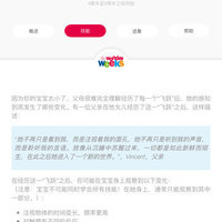 本应用方便的提示新父母何时宝宝的大脑发生重要的变化,或者说产生“飞跃”,在此期间宝宝在心智发育上取得重要进展,在此之后宝宝看待周边世界的方式也将发生重大变化,由于这些飞跃来的如此之快,眼中的“新世界”有时会让宝宝害怕,因而这个过程一开始可能会出现各种症状——寝食不安、哭闹、粘人、偏执,父母往往为此精疲力尽,深感挫折。