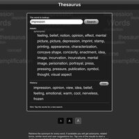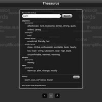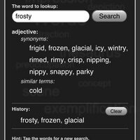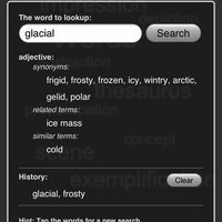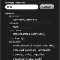 Retrieve the synonym for every word. If available you will get antonyms, related terms, similar word and user suggestions too. Tap one of the results to start a quick new search for that term. It keeps a history list of your search terms as well.