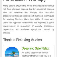 Many people worldwide are affected by tinnitus not by physical causes, but by emotional or neurological causes. You can combine the therapy that will revitalize damaged cells in your hearing with the relaxation procedures of self hypnosis that accompanying the Tinnitus Therapy app.