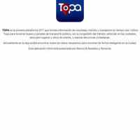 TOPA es la primera plataforma SITT que brinda información de movilidad, tránsito y transporte en tiempo real. Utilice TOPA para localizar buses y paradas de transporte público, ver la congestión del tránsito vehicular en las ciudades, descubrir lugares y sitios de interés, y realizar denuncias ciudadanas.