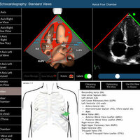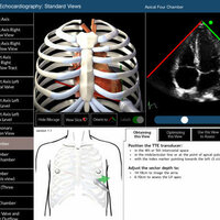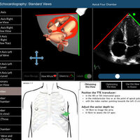 Each TTE view can be selected from a menu at the left of the screen, or by using arrow buttons to go to the next or previous view in the list. For each TTE view, the 3D model of the probe, ultrasound plane, heart and rib cage can be rotated in the horizontal or vertical plane to view it from any angle.