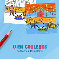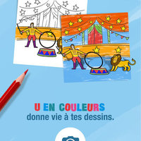 Grâce à U en couleurs, vous pouvez donner vie aux animaux du cirque présents dans le cahier de coloriage « La piste des couleurs » des Magasins U. Téléchargez l’application pour animer le lion avec son dresseur et faire faire des acrobaties à l’éléphant !