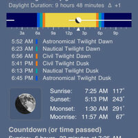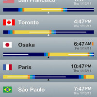 VelaClock is a world clock with unique features and an easily configurable user interface. VelaClock's feature set is ideal for photographers and outdoor enthusiasts. Users can quickly display the time of sunrise, sunset, dawn and dusk for three kinds of twilight (civil, nautical, astronomical), moon phase and tilt, and much more. VelaClock was the featured app at TUAW.com on 3/11/2011.