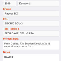 This app decodes heavy and medium duty truck Vehicle Identification Numbers (VINs) for most 1991+ truck manufacturers for the purpose of determining the year, chassis manufacturer, engine manufacturer, ECU family and validity. It will then list what software tool is needed to download the engine’s Electronic Control Unit (ECU) and if calibration and/or incident data is available. If incident data is available, it will give a brief description of the data. Major known issues are also shown in the notes section.