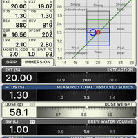 • Fully functional with or without a coffee refractometer. Refractometer measurements may be plotted separately using measured total dissolved solids (% TDS) and Beverage amounts to chart and compare actual brew results to design target values.