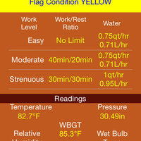 After an update you will be presented with a flag condition button on the bottom left of the screen. The flag condition is derived from the WBGT estimate. If the flag condition is not “NONE”, you may click on the condition to yield work to rest ratios and water consumption given the current estimated flag condition. These figures are posted as a quick and portable reference only. Guidance for these figures are acquired from the U.S. Marine Corps Order 6200.1E dated June, 2002. You are strongly advised to read the complete guidance to know what each entry means.
