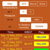 The app can provide guidance on work/rest ratios and fluid intake due to high temperatures. WeatherFX is an app that can retrieve temperature, barometric pressure and relative humidity based on the iPhone/iPad GPS data. The app will also approximate the wet bulb and wet bulb globe (WBGT) temperatures from the retrieved values. Please note that the WBGT is just an estimate. The estimate does not account for wind or low light conditions. The estimate is based on a moderate amount of sunlight. True WBGT can only be acquired through WBGT instrumentation.