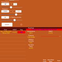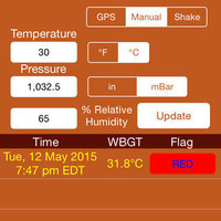 Besides acquiring the weather from GPS you may get your own estimates for wet bulb and WBGT temperatures by typing temperature, pressure and humidity into the respective text fields. Click the “Manual” segmented button, enter the white fields followed by clicking the “Update” button.