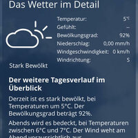 Nach dem Start hast Du sofort alle wichtigen Wetterdaten zu Deinem aktuellen Standort auf einen Blick. Zusätzlich kannst Du Dir punktgenaue Wetterinformationen und detaillierte Prognosen für die kommenden 48 Stunden - oder die nächsten 9 Tage ansehen.