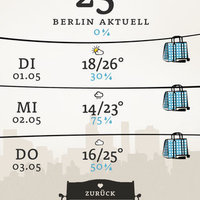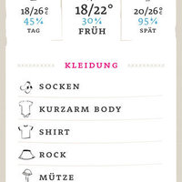 Diese Informationen erhält man übrigens auch für die kommenden Tage, wenn man auf „Vorhersage“ klickt. Mit dem Baby unterwegs? Kein Problem: Einfach den Standort ändern und die App zeigt Outfit und Tasche für die neue Position an.