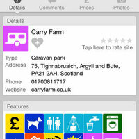 Then tap a site to bring up its details page. The site details page shows icons representing features the site has to offer, such as toilets, showers, power, pet friendly, and so many more! It also shows the name, address, contact details, a user rating, user reviews, prices, photos and even a handy 7 day weather forecast.