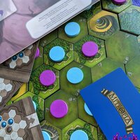Components. Again, this is a near-retail prototype copy, so the components are very close to what will be available and in each box upon a successful Kickstarter campaign. That said, these components are amazing! I told the publisher the day after receiving the game that I was very impressed with what was packed in the box. Now, I haven’t been able to Tetris the components back in the box and have the cover fit flush since I opened it, but what is inside the box truly is wonderful. The player discs are all nicely-painted wood bits. The player mats, cards, and terrain tiles are all great quality. The art on everything is super stellar, and I just love playing with everything! You know the feeling when you’re playing a game that just has that perfect tactile quality? That’s Mitropia. And this copy isn’t even upgraded!