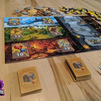 To setup the game, shuffle the cards and the treasure tiles and place them in their respective resting spots. Place a treasure tile on the MIN and MAX sections of each terrain type on the main board. Assign three goblin tiles to their spots on the cave sections of the main board to be dealt with after your adventure round. Each player receives 15 starting gold to begin their adventure. Deal each player nine cards and you are ready to begin!