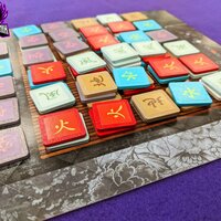 On a player’s turn they will choose one of these outlying tiles to move onto the board. Once placed, the player will choose tiles, based on the placed tile’s power, from the board. For example, “fire spreads tall,” so if a Fire tile is placed on the board, a player may choose any tile from the column where it was placed two spaces above or below the placed tile. The number of tiles that can be plucked from the board depends on the player’s “understanding” of the element (the number of tiles of that type on the player’s board +1). With two tiles on a player’s personal board, they can choose three tiles when moving that type of tile, in the example – fire.